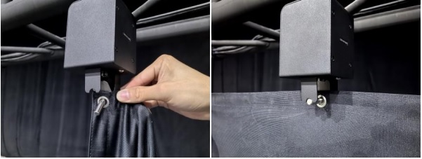 2) Sliding the rings in the cloth over the drop hook and then lock the drop hook by pushing