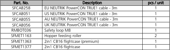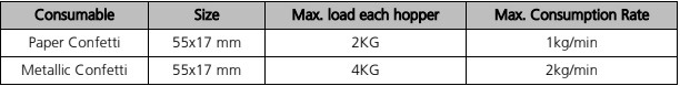 - 9-liter automatic confetti dosing hopper holds 4.4 lbs of paper or 6.6 lbs of metallic confetti for extended performance.