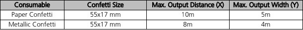 - Output Distance (X): 32.80ft (Paper Confetti), 26.24ft (Metallic Confetti)